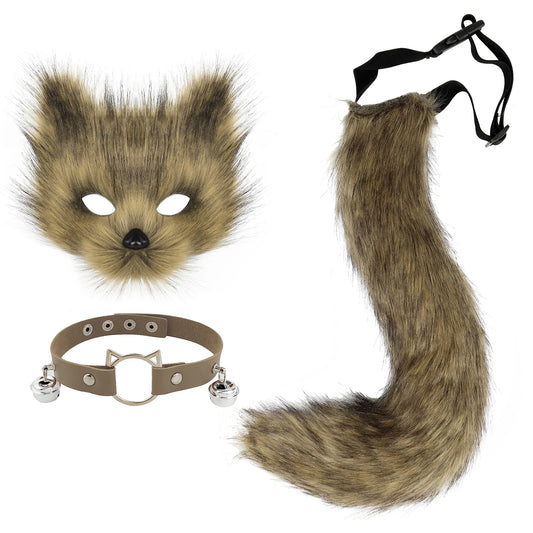 Fox Wolf Cat Mask Puffy Tail and Leather Necklace